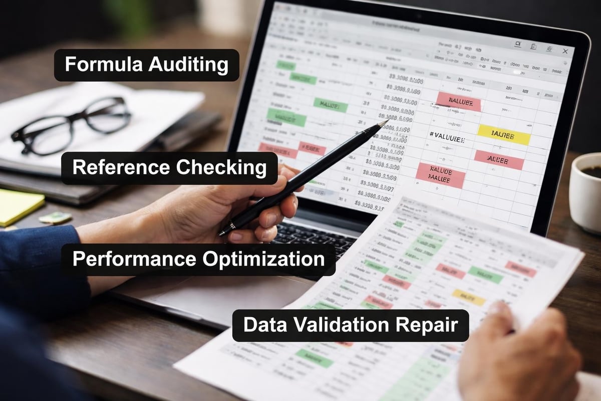Performance optimization addresses workbooks that freeze or crash. Large files often suffer from excessive formatting, volatile functions like INDIRECT and OFFSET, or unnecessary calculations. An Excel specialist can identify bottlenecks and restructure workbooks for speed.